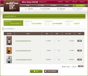 上のメニュー【カートを見る】をクリックするといつでも、ご購入予定の商品を見ることができます。 ここで本数を修正したり、選択中の商品をカートから削除することもできます。 本数を修正した場合、【再計算】ボタンを押すと商品の合計金額が再計算されます。 【ご注文方法の指定へ】ボタンを押すとご購入手続きへ進みます。 |