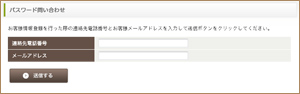 パスワードを忘れた方は・・・ 会員登録したときの電話番号とメールアドレスを入力して、【送信する】ボタンを押してください。登録メールアドレス宛にパスワードをお送り致します。 |