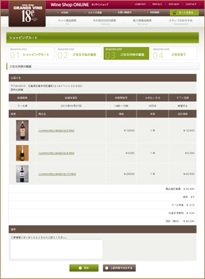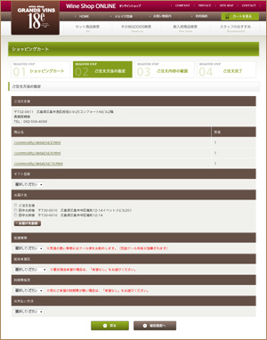 ギフト包装、お届け先、配達種類(通常便・クール便)、配送希望日、時間帯指定、お支払い方法(銀行振込・代引き)の指定ができます。 |