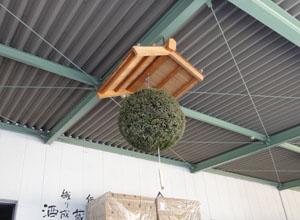 杉玉とは・・・杉の玉を束ねて球状に刈り込んで作る杉の玉のことで、門前に掲げ、新酒が出来たことを知らせ、酒蔵や酒場の看板とします。昔から新酒が出来る晩秋に行われていた行事。しかし、もともとはお酒の神様に今年も良い酒が出来ましたと感謝の気持ちを表すものです。起源はお酒の神様を御祭することで有名な奈良県の大神神社のご神体にある三輪山の杉にあやかったものです。