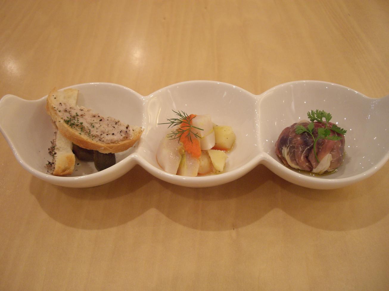 料理は、写真左から「豚のリエット」、「ホタテのグリーンマスタードサンド」、「ラタトゥイユの生ハム巻き」です。