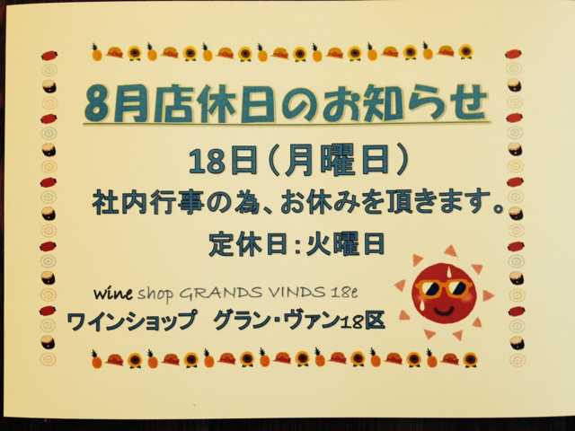 8月店休日のお知らせ